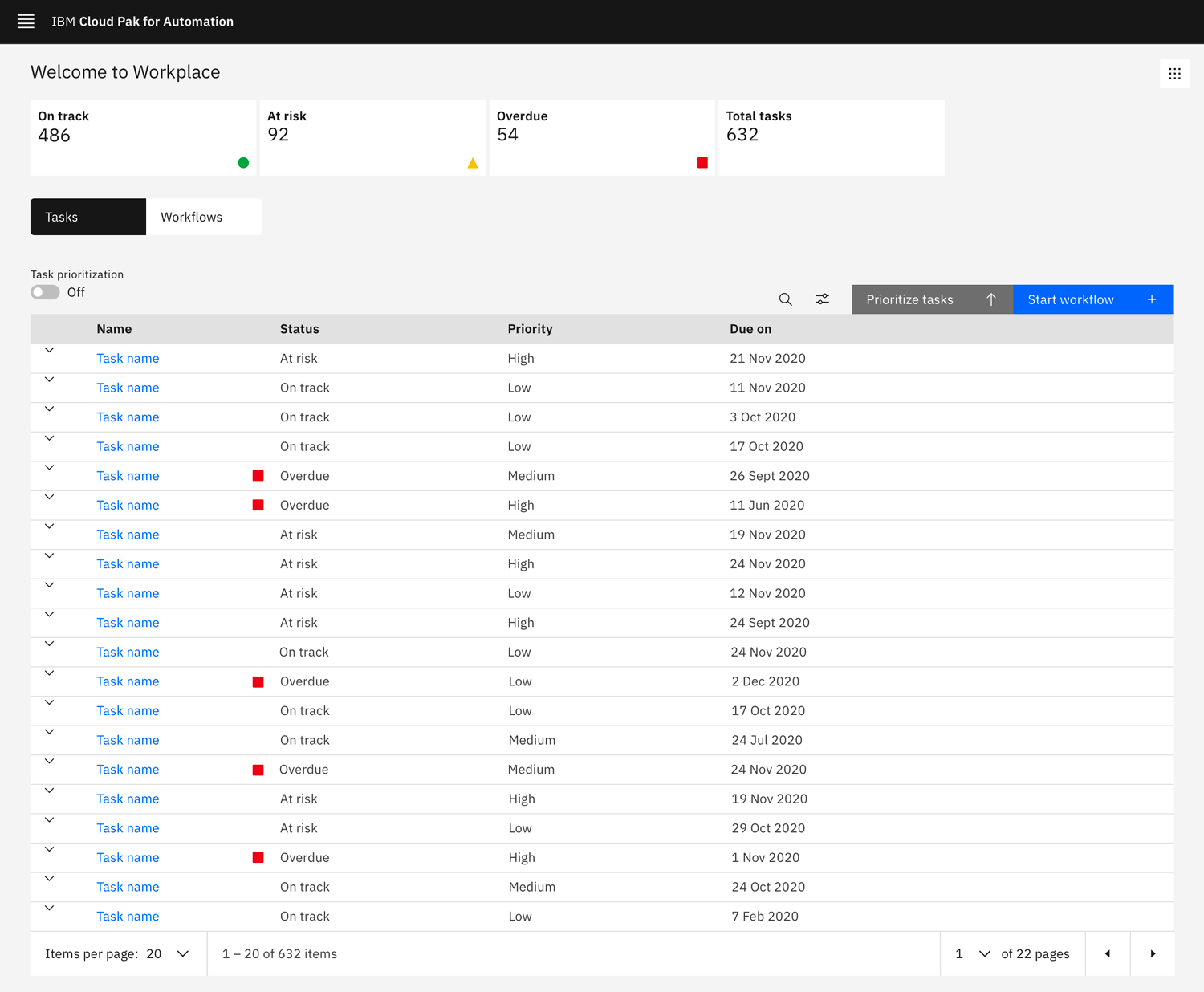 IBM Workplace is an offering from IBM Business Automation that allows users to track their tasks and manage their workload. Users can view a task’s priority, details, and due date.
